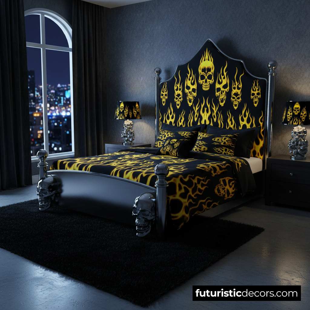 Complement the bed with matching nightstands featuring chrome skull handles or embedded flame designs, completing the ensemble for a consistent gothic-luxury aesthetic.