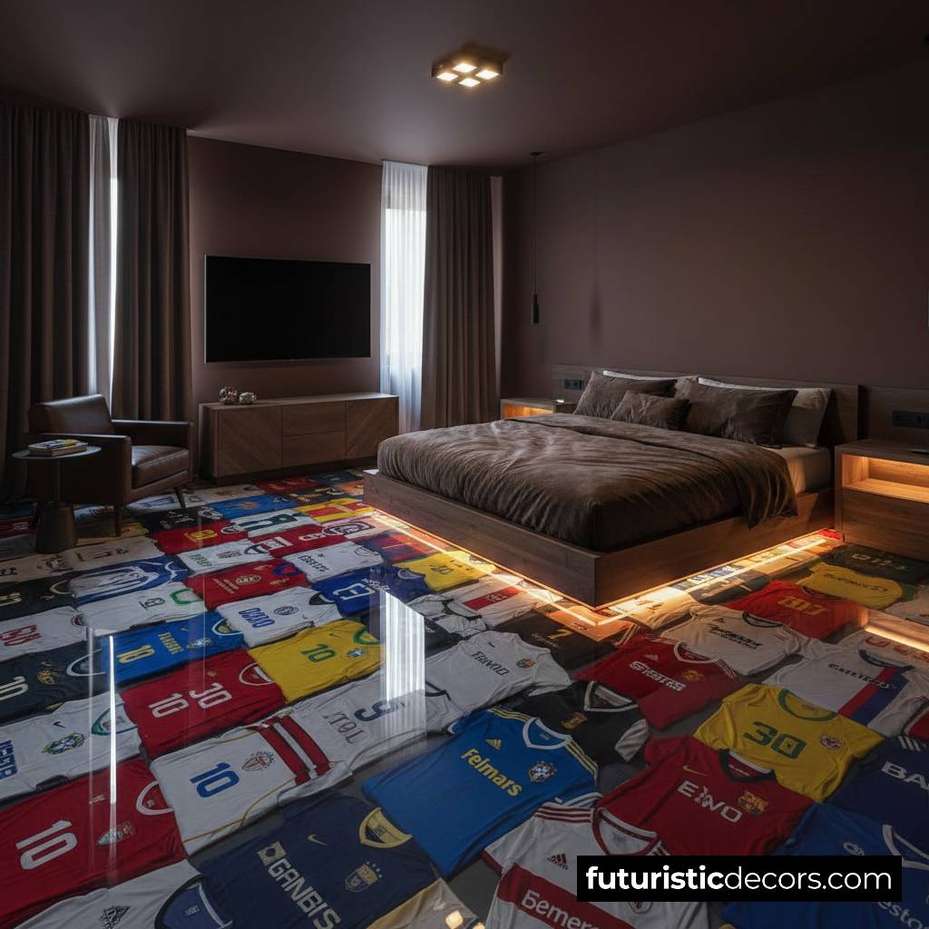 Imagine waking up every day surrounded by decades of football history beneath your feet. Bedrooms with epoxy jersey floors feel bold and inspiring, especially when paired with neutral furniture that allows the floor to shine.