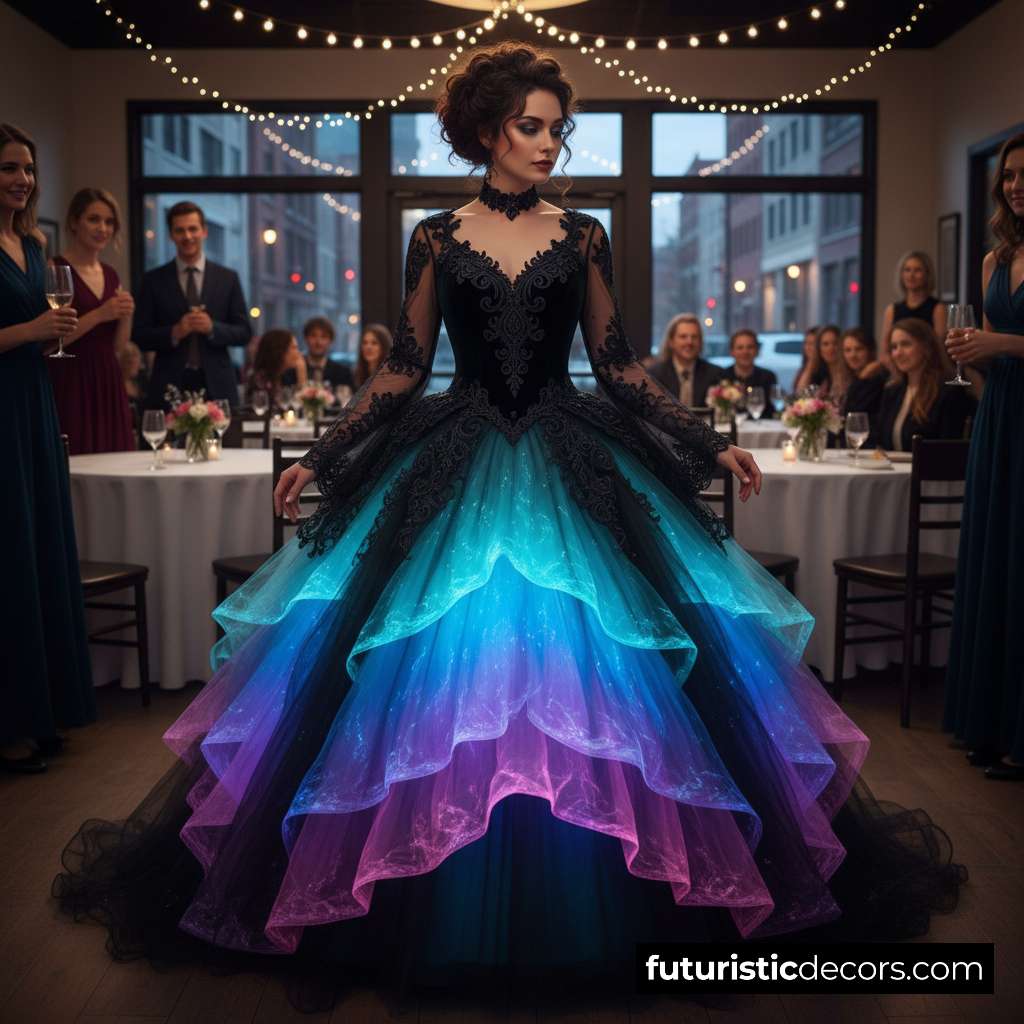 Designers typically use a combination of taffeta, satin, organza, and layered tulle. These fabrics are chosen specifically for their ability to catch light and reflect shifting aurora-like hues. The result is a skirt that moves like swirling light as you walk. Paired with embroidered lace on the bodice, the dress achieves both gothic sophistication and celestial vibrance.