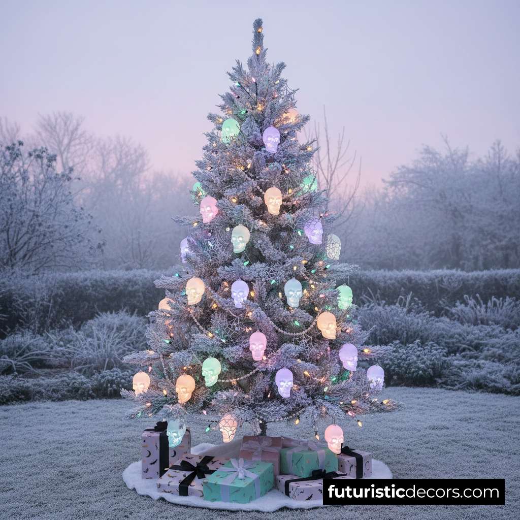 A snow-dusted or pure white tree acts as the ideal canvas for pastel decorations. It enhances color vibrancy, making the skull ornaments pop against the frosty background. Add iridescent tinsel and soft-hued LED lights to amplify the dreamlike effect.