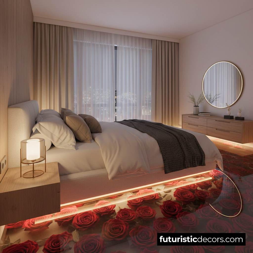 Small touches like candles, soft rugs, rose-inspired artwork, or luxurious throw blankets reinforce the romantic theme without feeling overly coordinated. Keep décor minimal to allow the floor to remain the focal point.