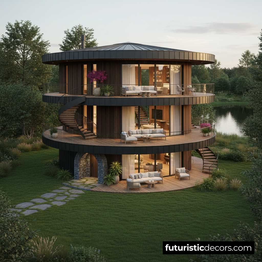 Many Tiered Tiny Homes use curved facades, spiral staircases, and round decks to enhance movement and aesthetics. The rounded shape allows the home to blend with its surroundings — whether it’s built into a hillside, by a lake, or deep within a forest.